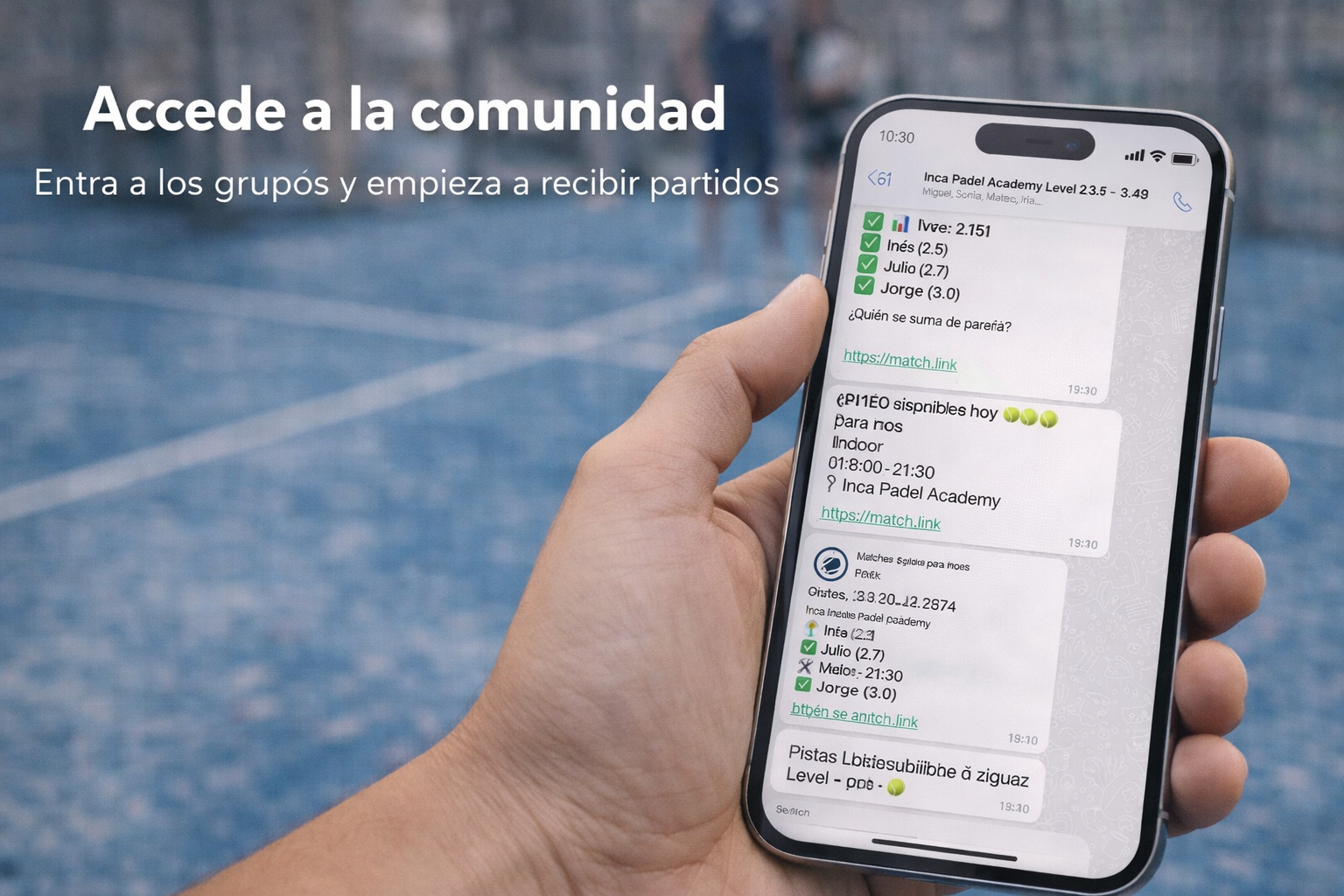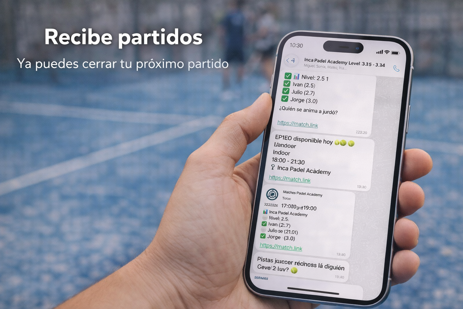 Con Padel Partidos encuentras partidos abiertos, te apuntas en segundos y empiezas a jugar cuando quieras.